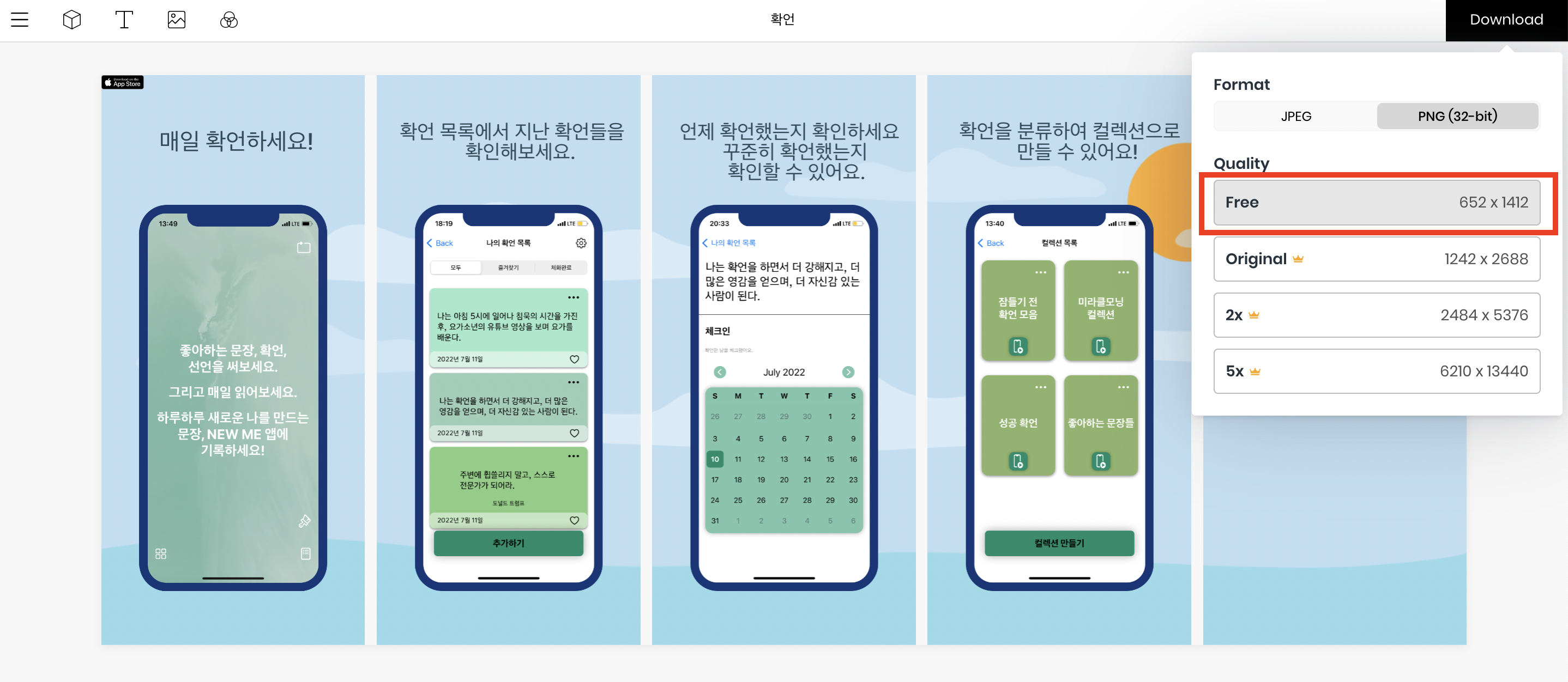 아래 화면에 보이듯이 652x1412로 사이즈가 정해져 있습니다. 그 밑에 Original이 제가 필요한 사이즈이긴 한데 유료라서 그냥 Free를 다운로드 받습니다.