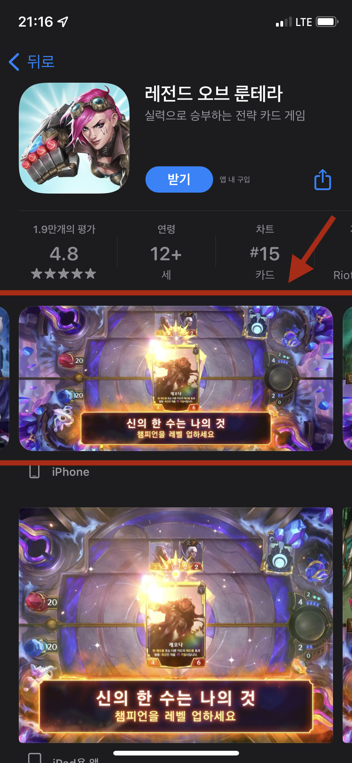 앱스토어에서 앱을 보면 빨간 화살표로 표시한 구역이 앱 미리보기(스크린샷)이 표시되는 부분입니다.
