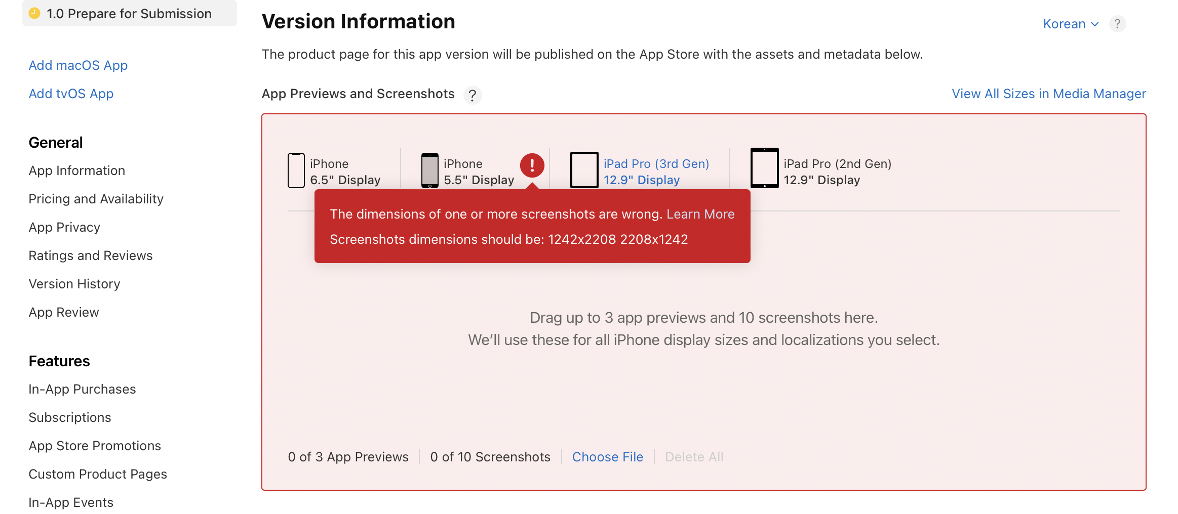 이미지 파일을 모두 Apple Connect 앱 스크린샷 제출에 드래그 앤 드롭하면 추가 완료입니다.