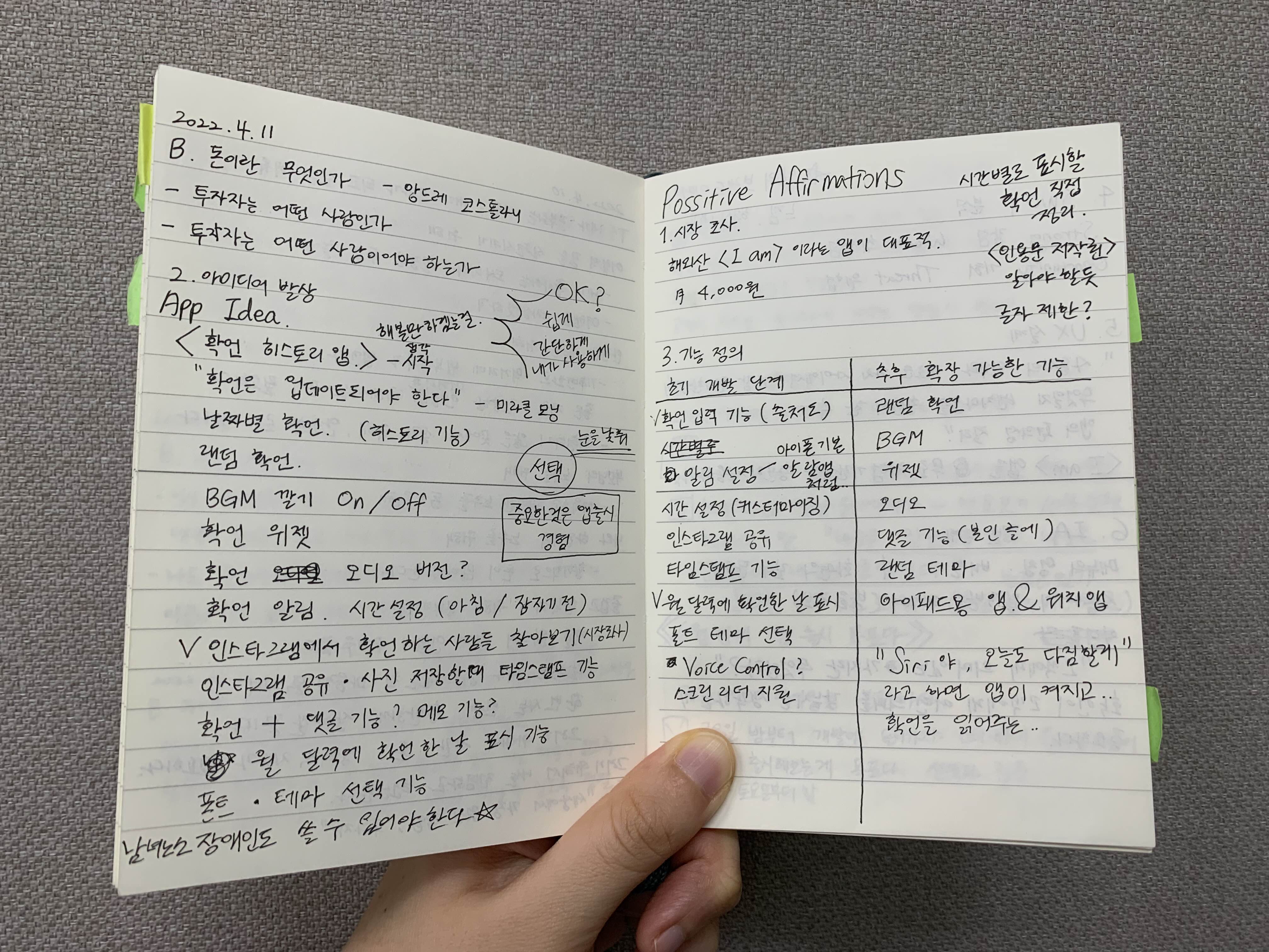 일단 시장조사를 해봤다. 확언과 명언을 보여주는 앱은 많았지만, 나만의 확언들을 기록하고 관리하는 앱은 찾을 수 없었다. 구현하고 싶은 기능들을 다 적어봤다. 그 전까지 앱개발 공부를 지지부진 끌어오고 있었는데, 만들고 싶은 앱이 생기니 적극적으로 찾아 공부하게 됐다.