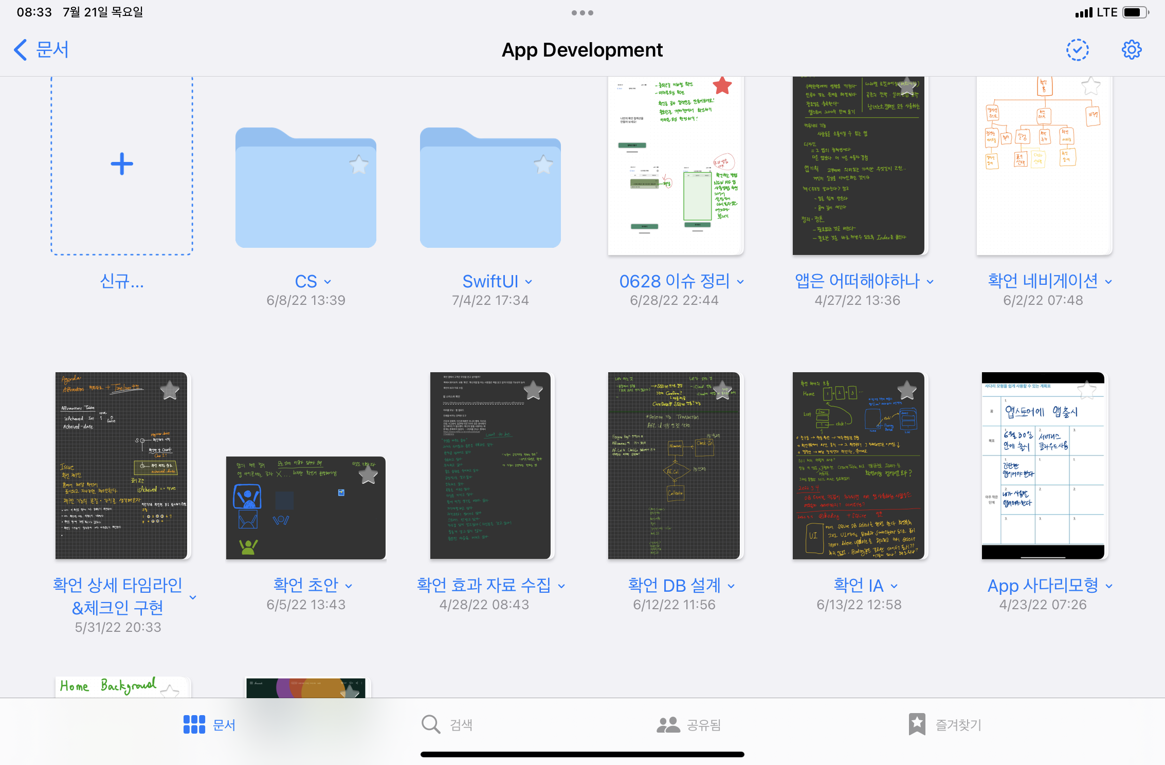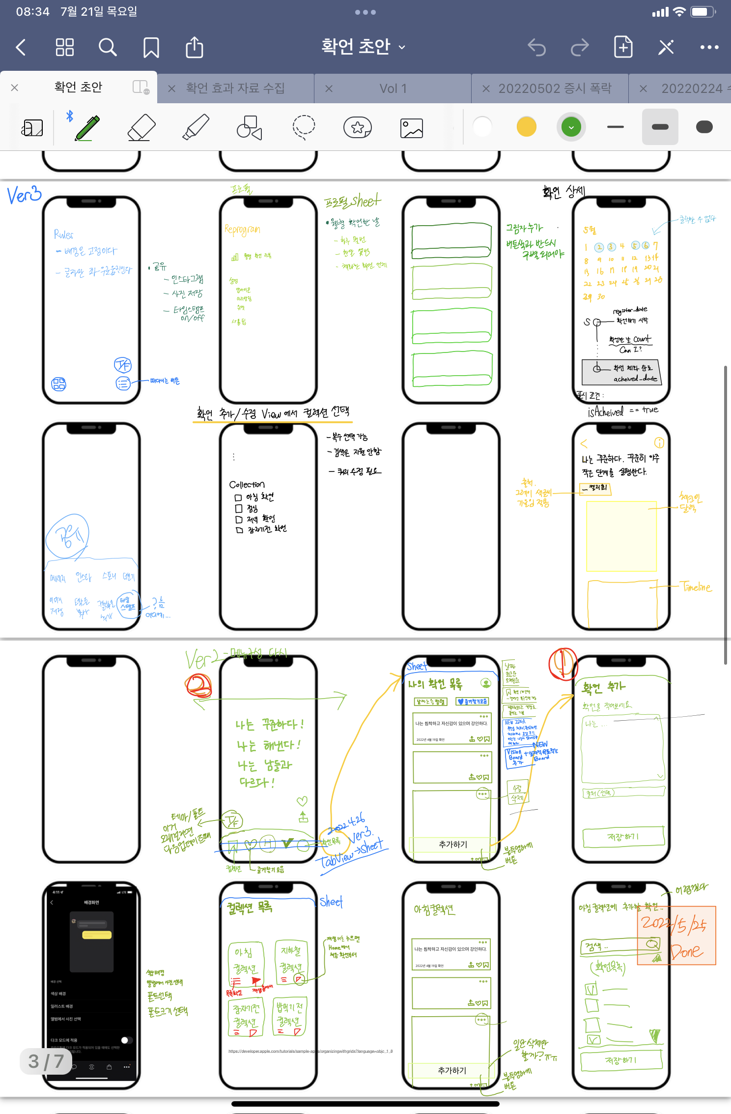Swiftui Tutorials를 보고 Landmarks 앱을 완성한 후 NEW ME 앱 작업에 들어갔다. 백엔드 개발자가 UI를 그리려니 완전 깜깜했지만 내가 좋아하는 UI를 가진 앱들을 매일 들어가보며 한 땀 한 땀 화면설계서를 그리기 시작했다.이 화면설계서를 그리기 위해 아이패드미니를 당근에서 샀다. 당연히 애플펜슬도*확언 UI 그린 것 굿노트 스크린샷 첨부