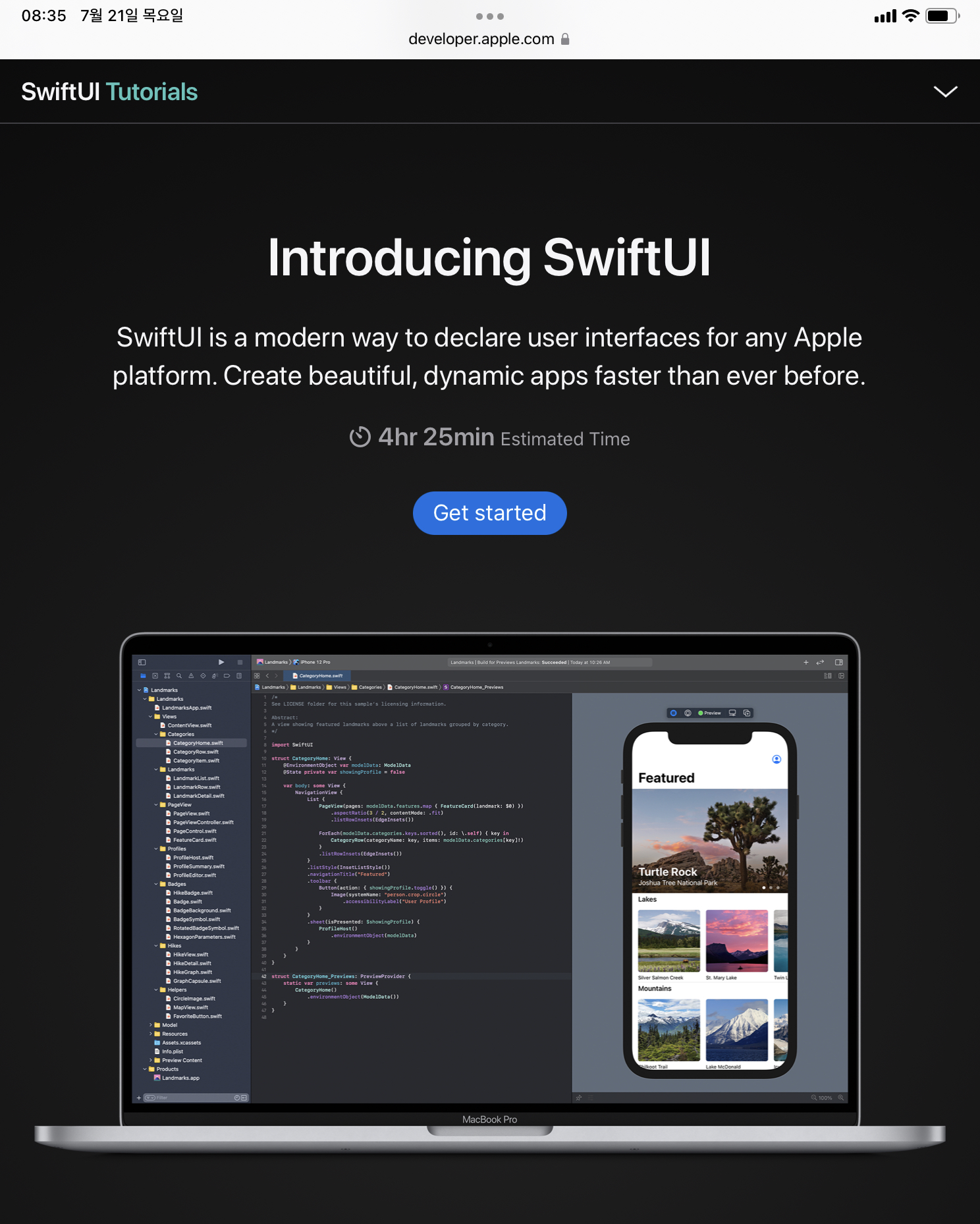 ios 개발을 공부하는 사람들에게 유명한 Hacking with Swift 사이트에서 swift 문법을 간단하게 공부한 후 100days of SwiftUI 를 따라가다가 Day26에서 고꾸라졌다^^; 이제보니 참 일찍…. 그렇게 Paul(Hackingwithswift의 수장)로부터 멀어지고, 아무래도 다른 공부 리소스를 찾아야 할 것 같아 어디서 들은 애플 공홈 튜토리얼을 찾아 들어갔다. 생각보다 매우 자세하고 체계적으로 튜토리얼을 만들어 놓은 것을 발견했다. 강력 추천합니다.