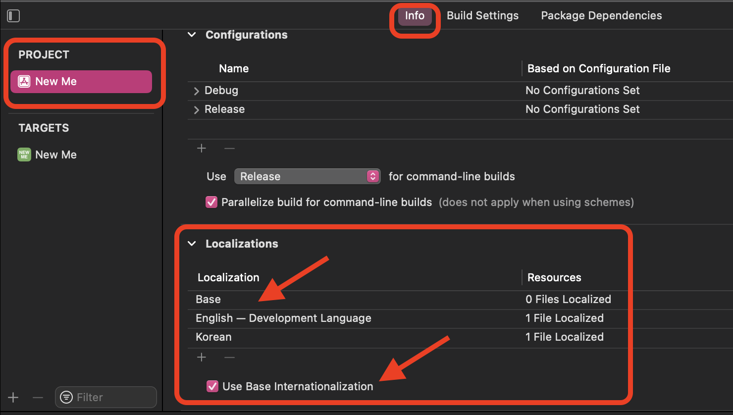 먼저 Xcode 앱 내 설정을 확인해봅니다. Project > Info > Localizations 항목입니다. [Use Base Internationalization]이 체크된 상태입니다. 체크를 해제하면 Base 항목이 사라집니다. 중요한 건 Base가 아닙니다. English - Development Language 라고 돼있습니다. 기본적으로 iOS 개발 언어는 영어입니다. 한가지 더 보겠습니다.