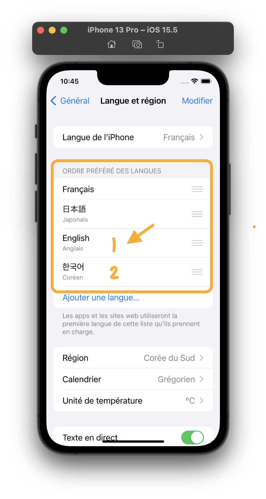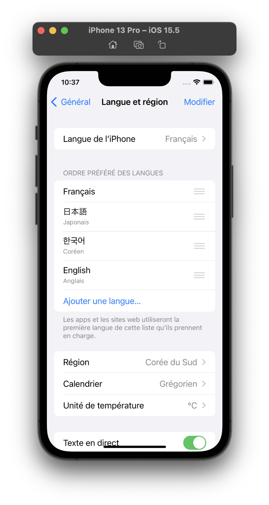 iOS는 가장 먼저 언어 & 지역 메뉴에서 사용자가 선호하는 언어 순서를 확인합니다. 'iPhone 언어'를 프랑스어로 설정해놨으니 가장 선호하는 언어는 프랑스어입니다. 그 다음 순서인 일본어는 무시하고, 세 번째로 선호하는 언어가 한국어네요! 마지막으로 선호하는 언어가 영어입니다. 눈치채셨나요?