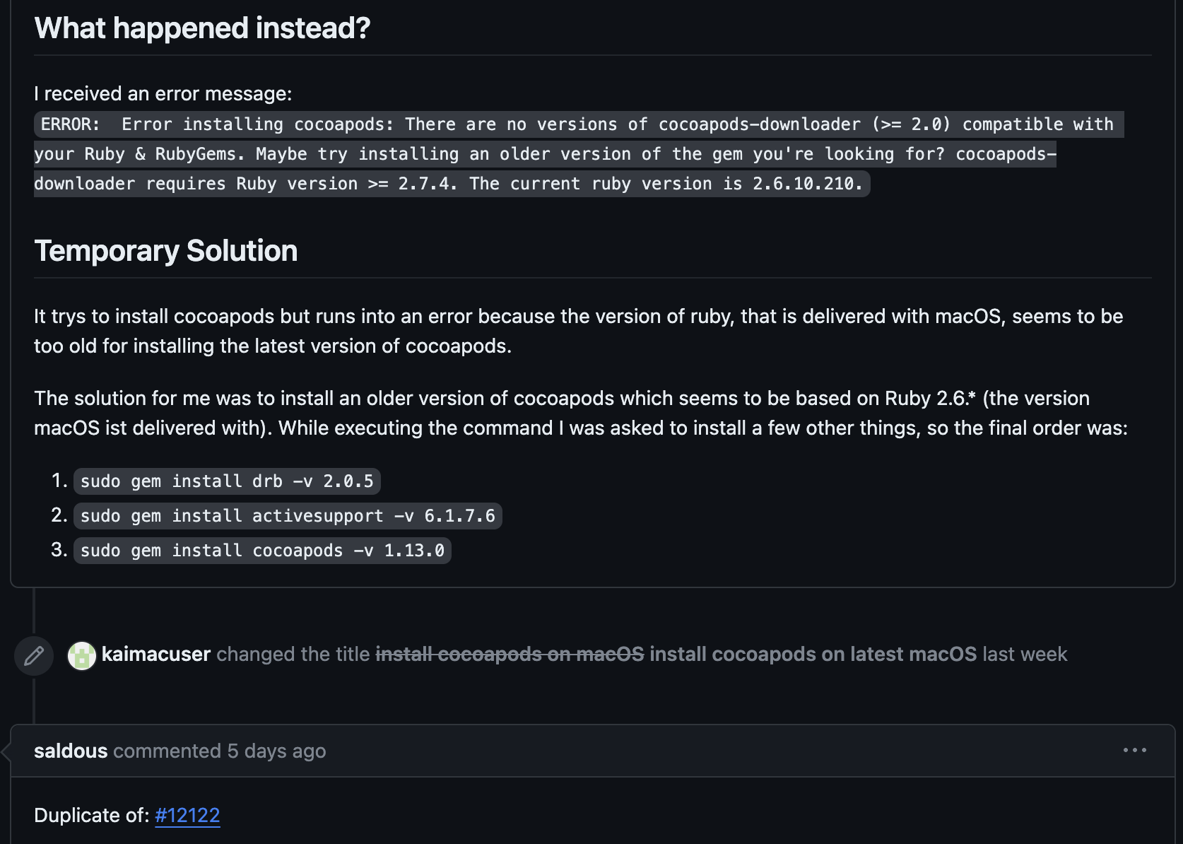 $ sudo gem install cocoapods -v 1.13.0두번째 방법은 최신 버전의 cocoapods를 설치하는 방법인데, 내가 해보진 않았다.
