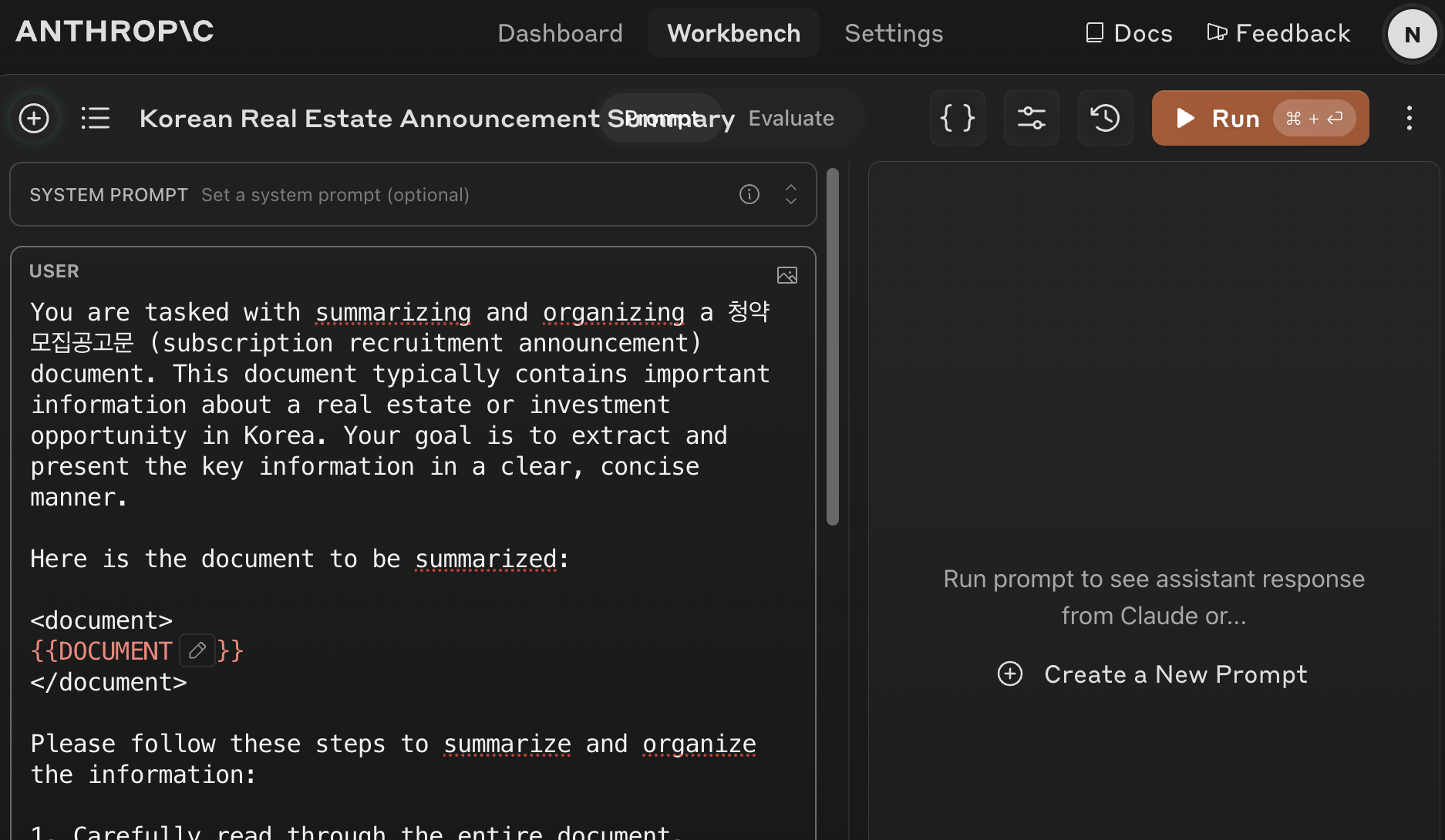 Anthropic Console에 프롬프트 생성하는 기능이 있습니다. 이걸로 초안을 썼습니다.
