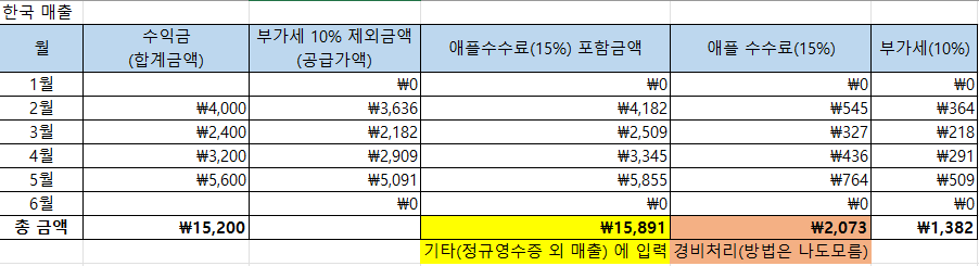 애플수수료(15%) 포함금액을 계산하여 기타(정규영수증 외 매출) 항목에 입력했다.